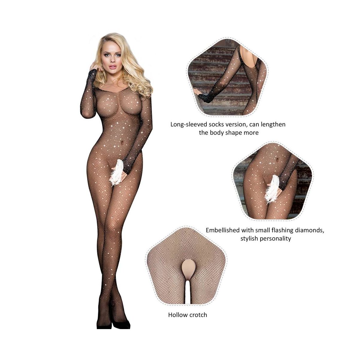 nesite dašak sofisticiranosti i zavodljivosti u svoju kolekciju donjeg veša uz ovaj crni bodystocking sa dugim rukavima i dijamantima za punije žene. Savršen za posebne prilike, intimne trenutke ili kao deo kostima, ovaj bodystocking kombinuje eleganciju i udobnost u jednom komadu.