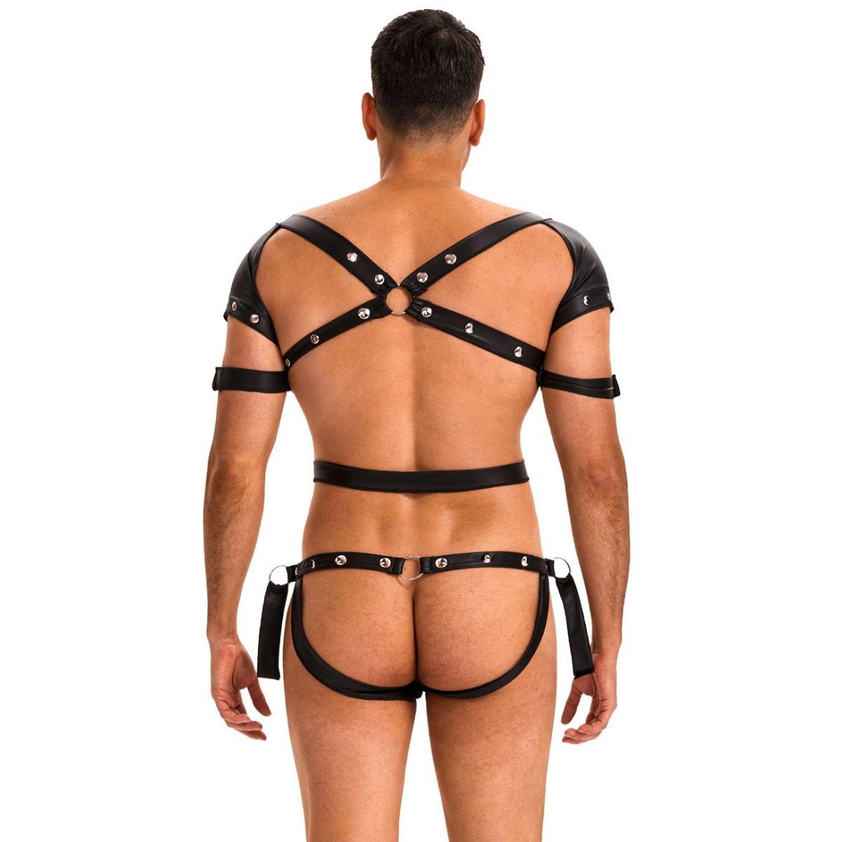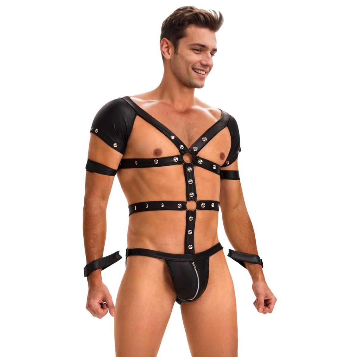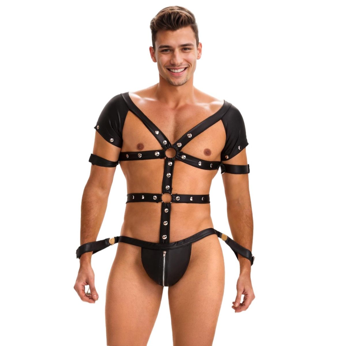 Ovaj muški bondage kombinezon donosi smelu kombinaciju materijala, detalja i funkcionalnosti, savršenu za one koji vole dominaciju, igru i edgy estetiku. Izrađen je tako da spoji udobnost, provokativan izgled i elemente vezivanja koji pojačavaju fetiš doživljaj.