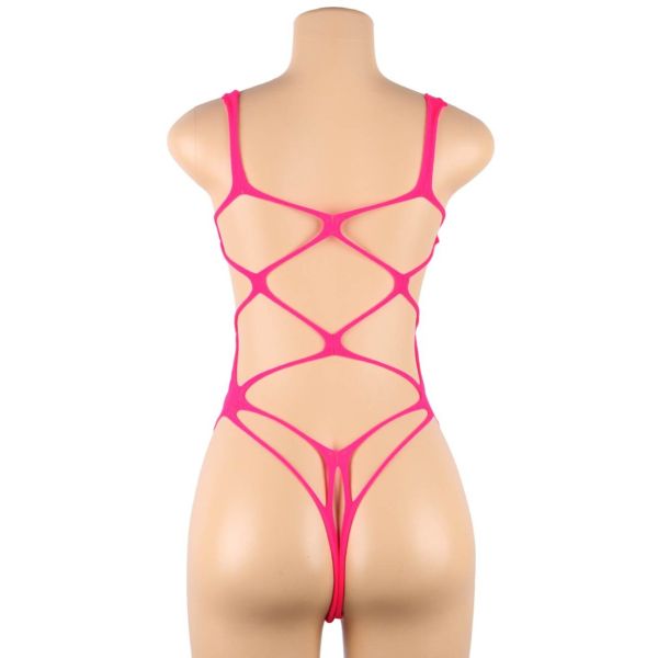 roze boja, visokoelastično najlonsko predivo, mrežasti dizajn sa isečenim detaljima, otvoren donji deo, veličine M–XL – ženski sexy bodystocking od mrežastog materijala.