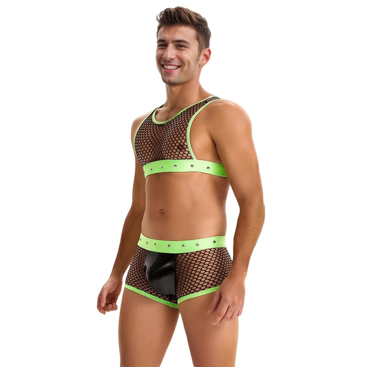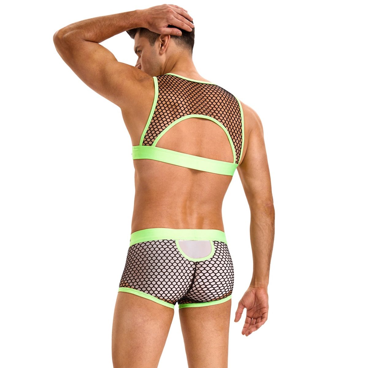 Zeleni muški seksi veš – mrežasti materijal, prednji U-oblik, široka elastična traka sa nitnama, otvoreni zadnji deo.
